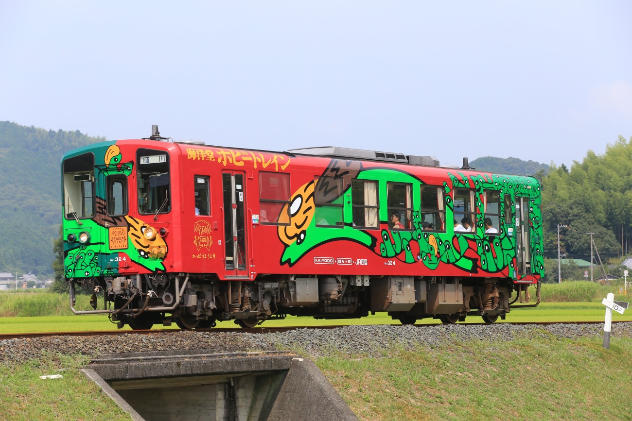 赤と緑のド派手な車両が予土線を通り過ぎていく。予土線3兄弟の次男こと「海洋堂ホビートレイン かっぱうようよ号」である。予土線沿線地域には、のどかな里山とともにかっぱ伝説が残っている。四万十川にはかっぱがすんでいる・・残念ながら私はまだ見たことがないけれど。